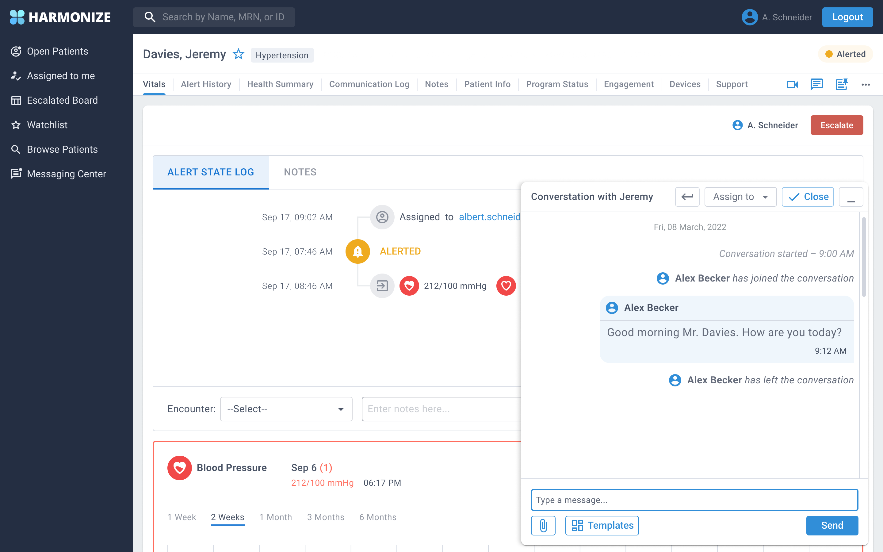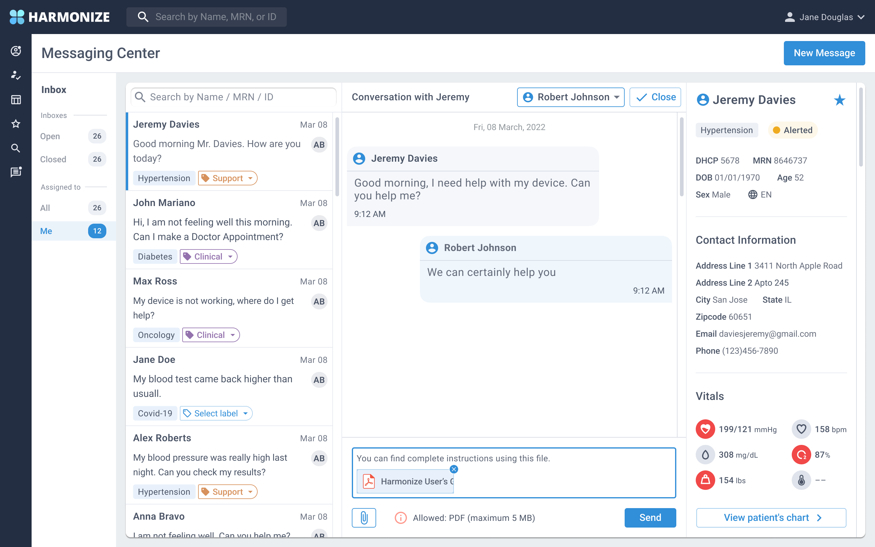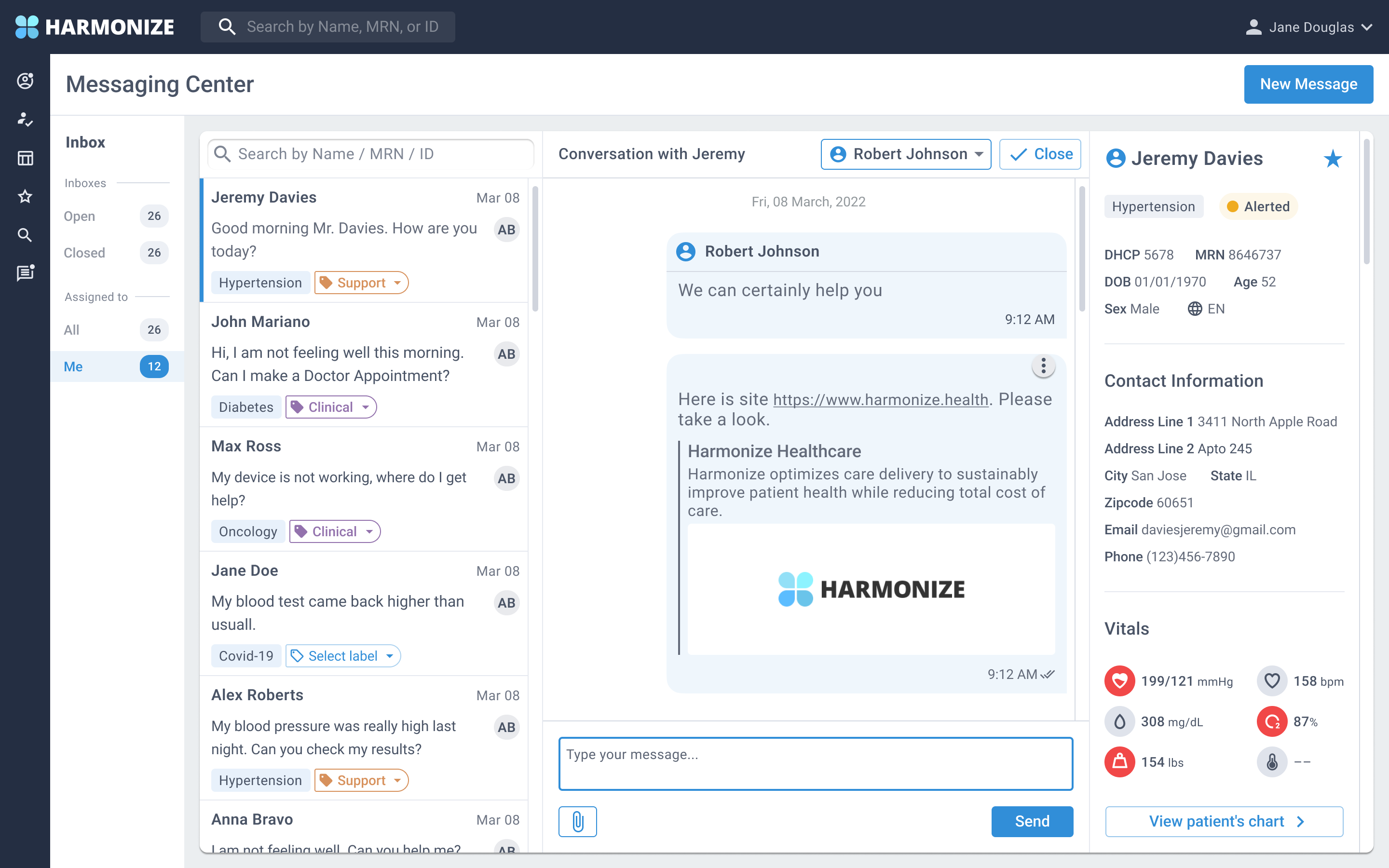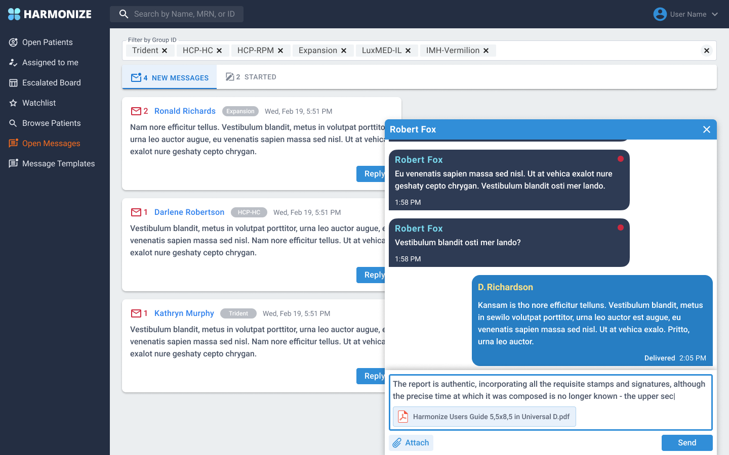 Harmonize has a web/app where health care providers interact with patients. Harmonize introduced a new feature where health care providers could interact with patients via the "Messaging center". The first version contained a chat box and past messages that were floating and overlapped each other.