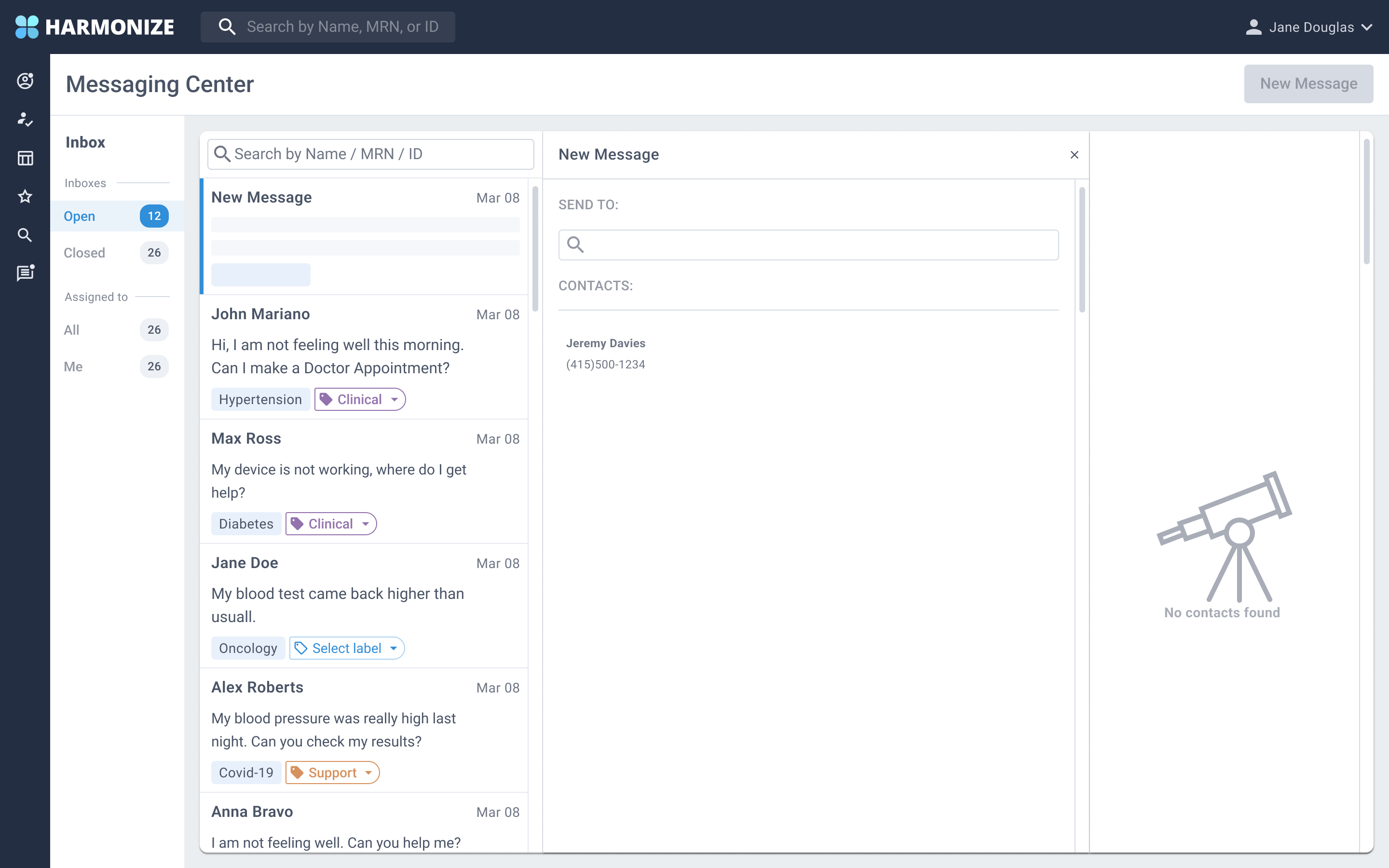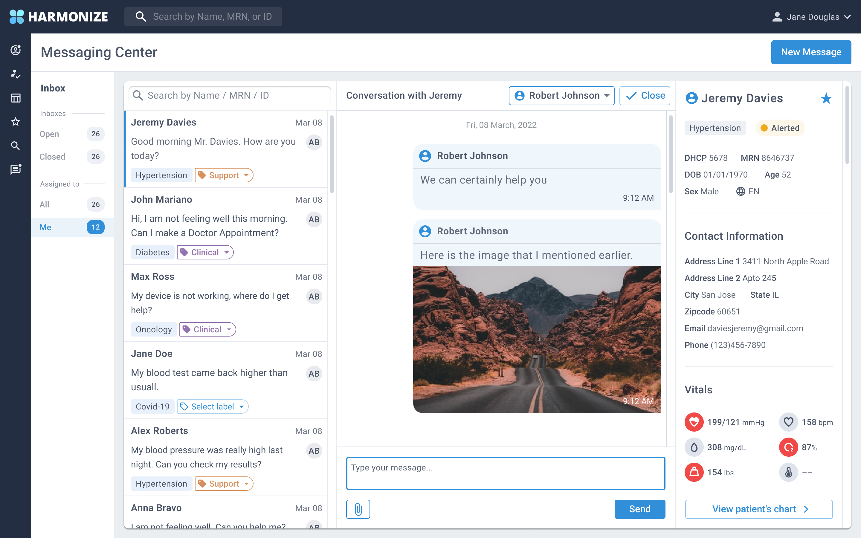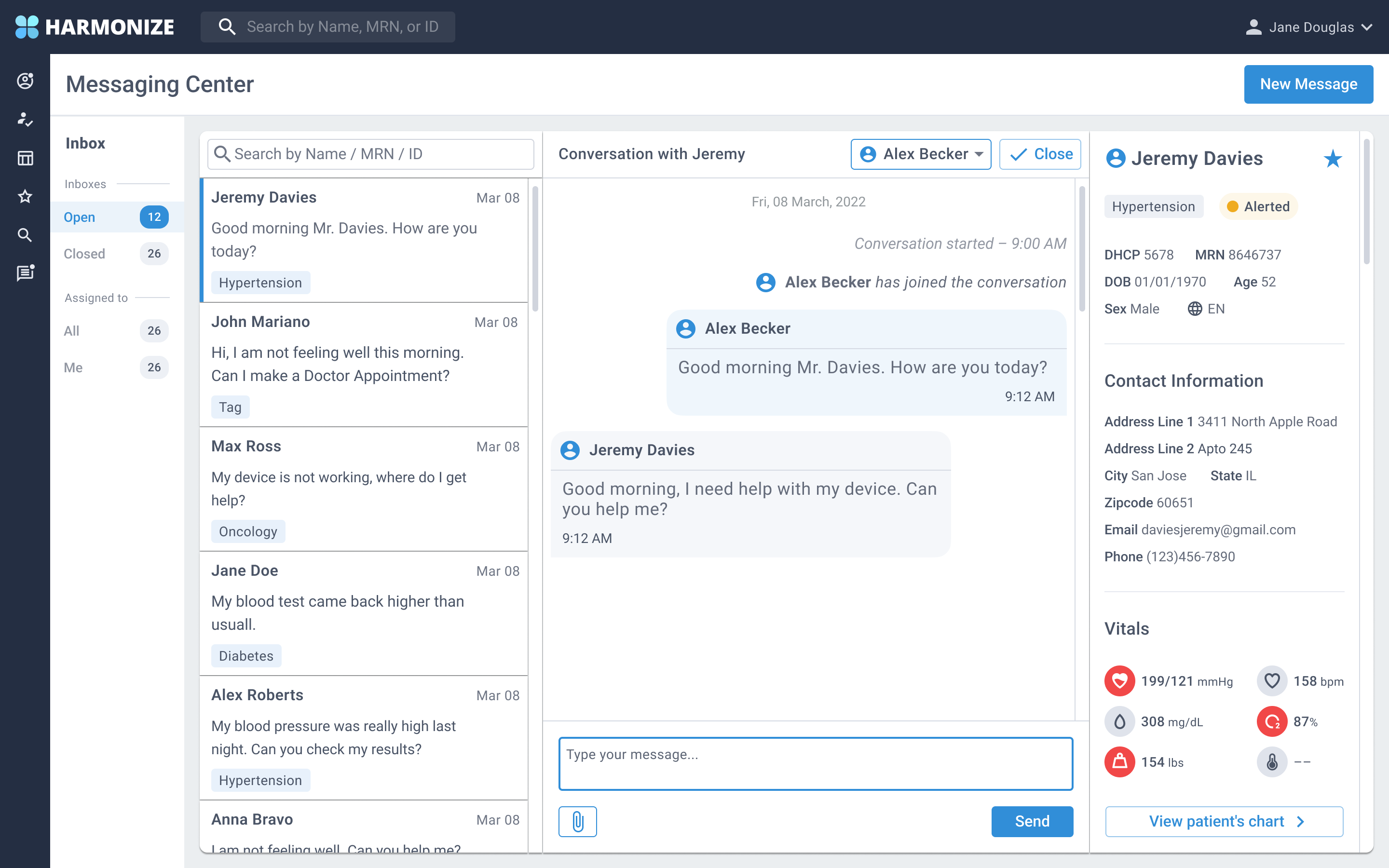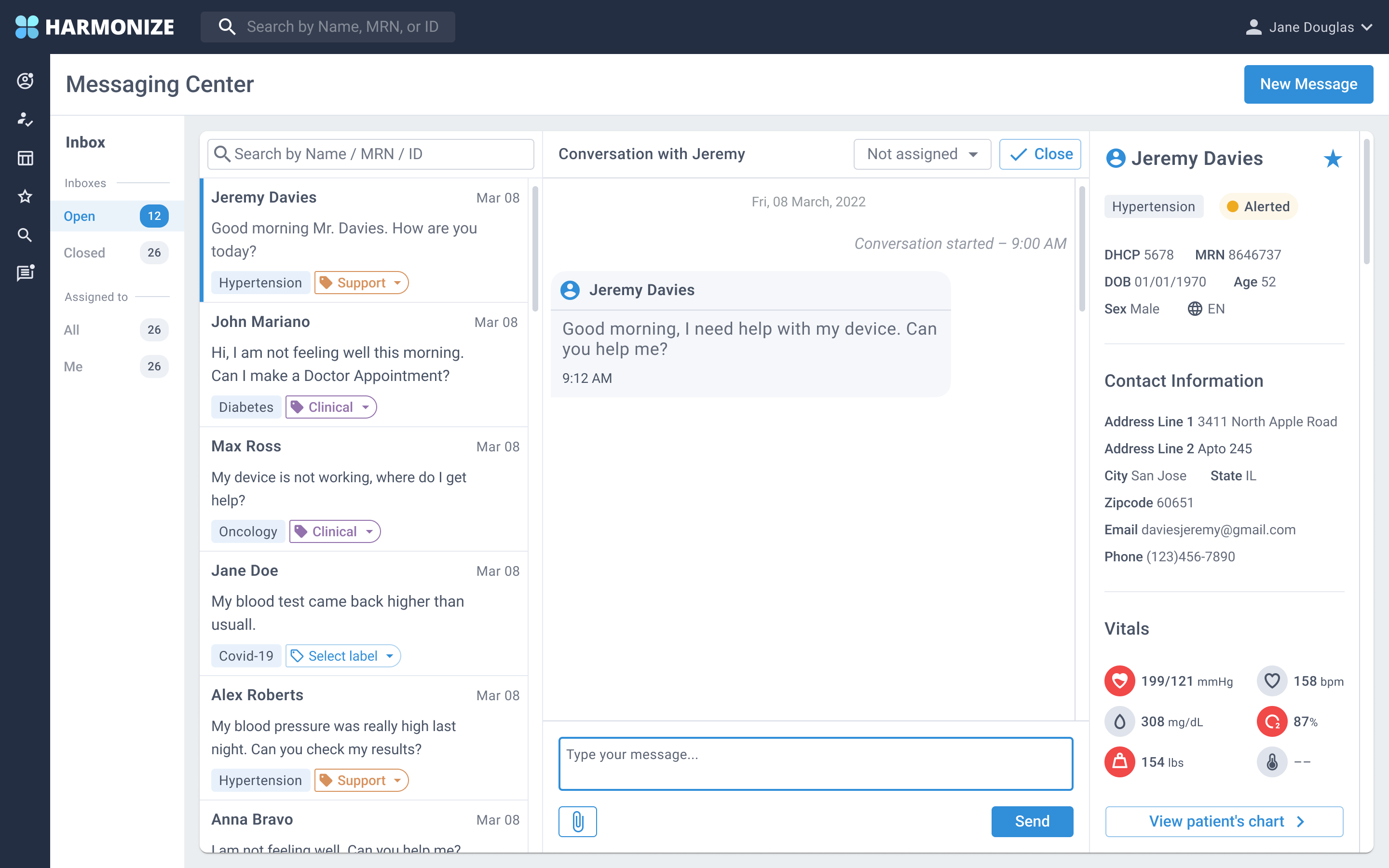 Create a three column solution where the provider can have access to the messaging inbox, chat box and the patient information. Provider should be able to view patient vitals and a summary of the patient's information.